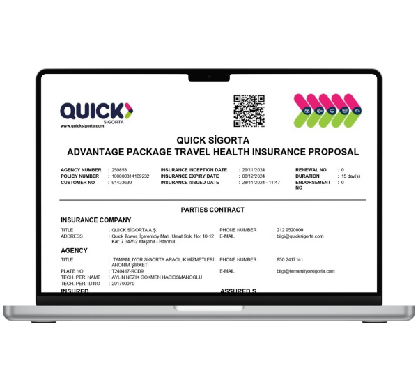 Vize dosyanıza uygun QR kodlu seyahat sigortası poliçeniz. Tüm Schengen ülkelerinde geçerlilik.