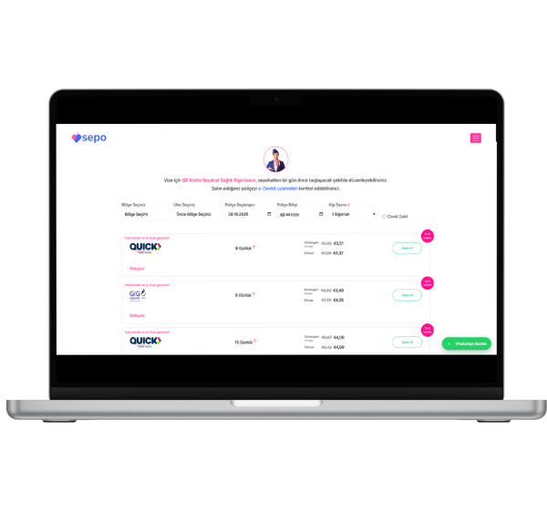Fiyatlar tamamen şeffaf; teklifleri tek ekranda karşılaştırın, Schengen’e %100 uygun QR kodlu seyahat sağlık sigortası poliçenizi anında e-posta veya WhatsApp ile teslim alın.